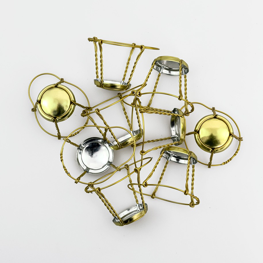 30 vnt AUKSINĖS spalvos, putojančio vyno kamščių apsauginė vielutė su lėkštele.