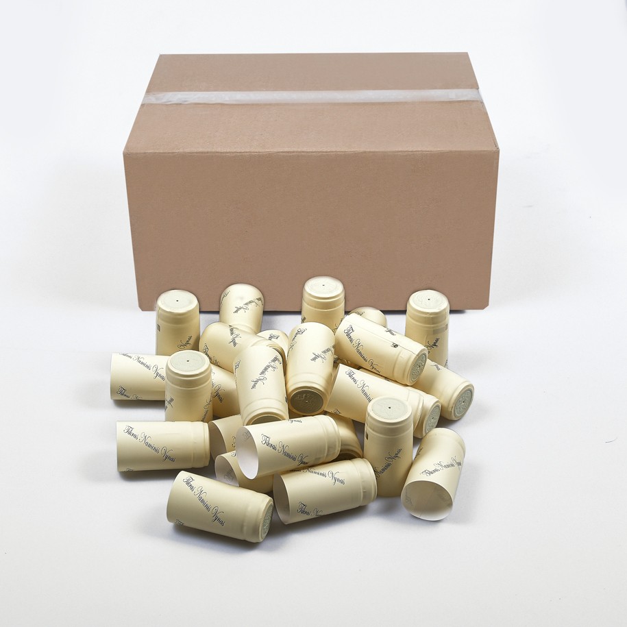Termokapsulės vyno buteliams KREMINĖS su užrašu „Tikras Naminis Vynas“ 1000 vnt. Įmerkus į verdantį vandenį, pakaitinus virš karštų garų ar fenu susitraukia.